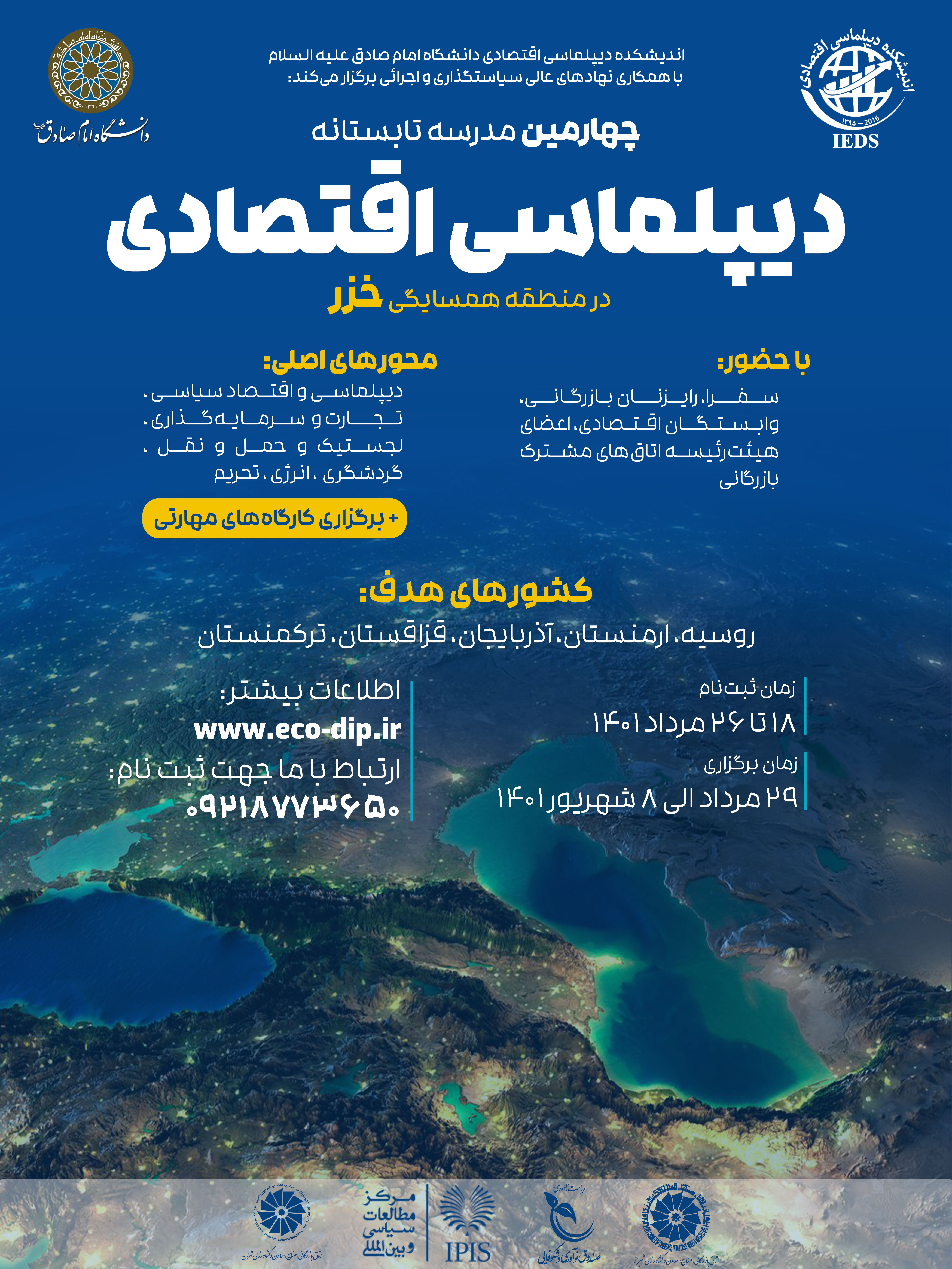 The Fourth Economic Diplomacy Summer School’s special focus on neighboring Caspian states is scheduled to be held online from Aug. 20-28 by Imam Sadeq (PBUH) University’s Economic Diplomacy think tank in cooperation with Iran National Innovation Fund and the Institute for Political and International Studies, in addition to Tehran and Shiraz chambers of commerce.
