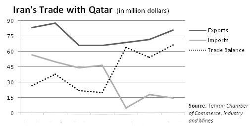 Trade between the two oil-producing countries has tilted in favor of Iran over the past years as sanctions have inhibited Qatar from exporting to its northern neighbor in the Persian Gulf (see graph).