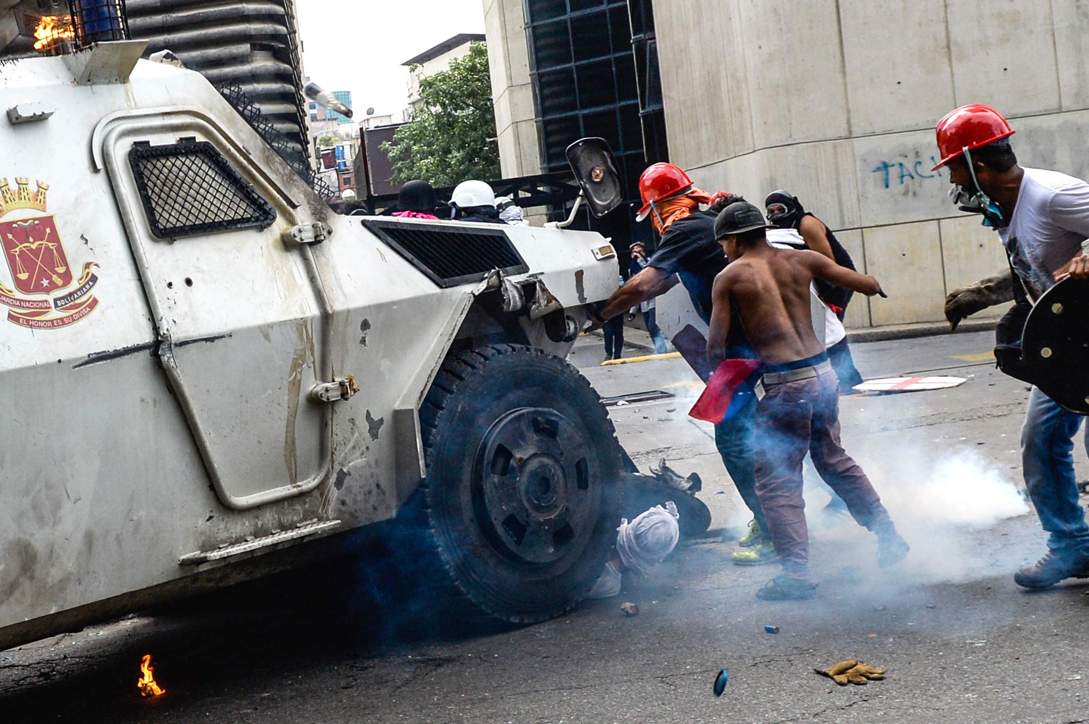 Caption: A police armored vehicle plows into a group of protesters in Caracas, Venezuela, on May 3.
